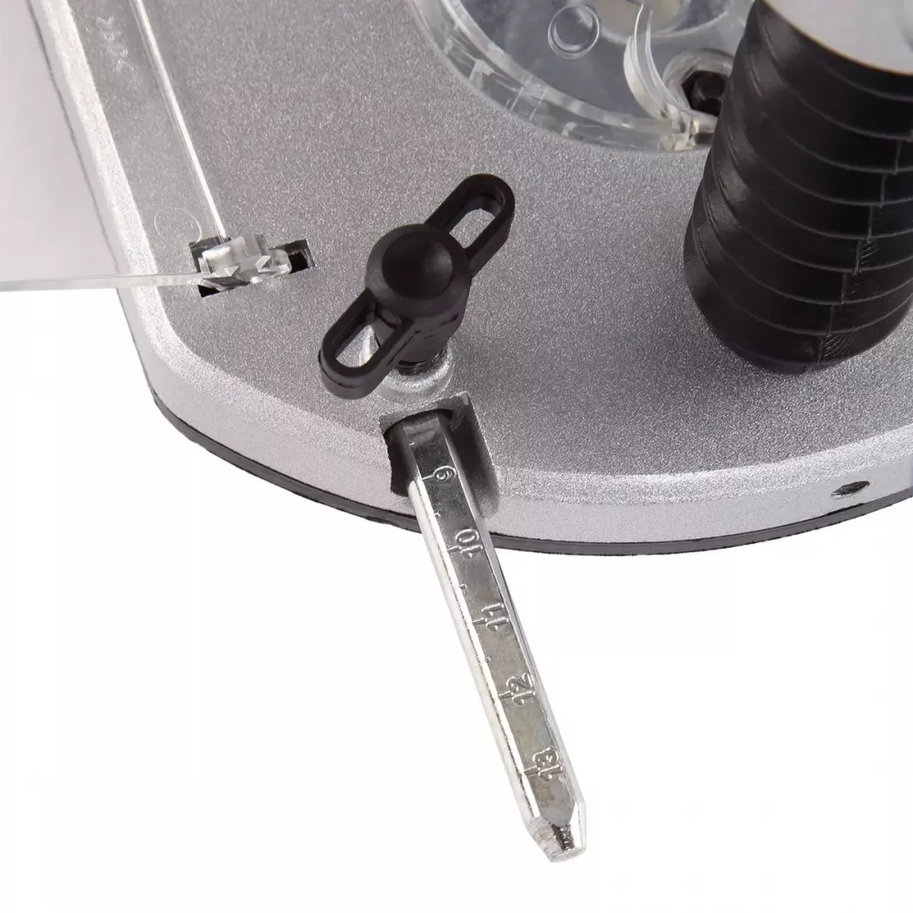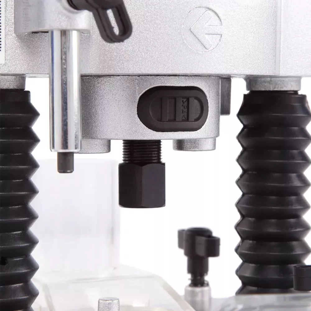 Точная настройка глубины фрезерования обеспечивается трехпозиционным регулировочным барабаном и стержнем-ограничителем с ручкой точной настройки. Максимальный рабочий ход составляет 60 мм при точности позиционирования 0,04 мм.