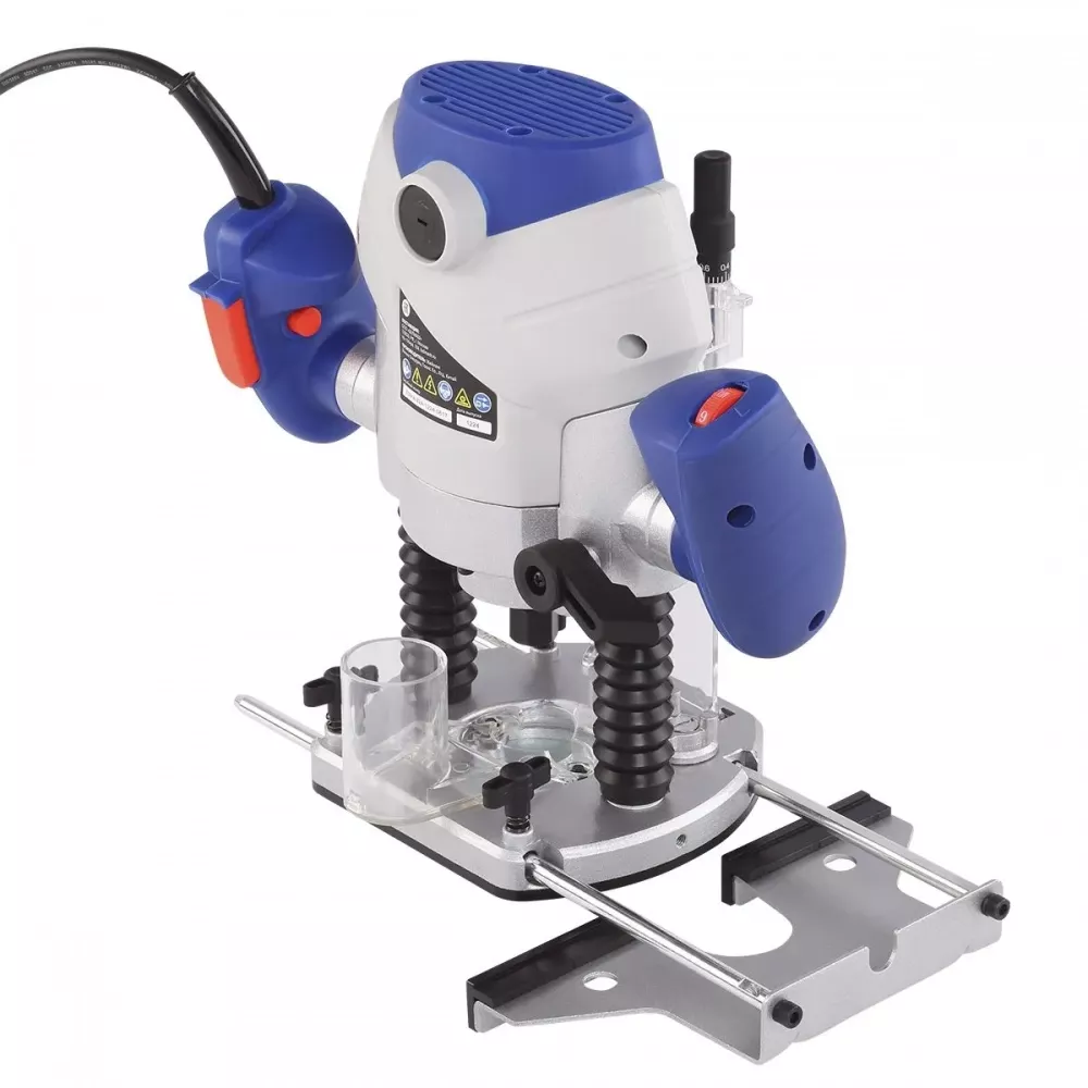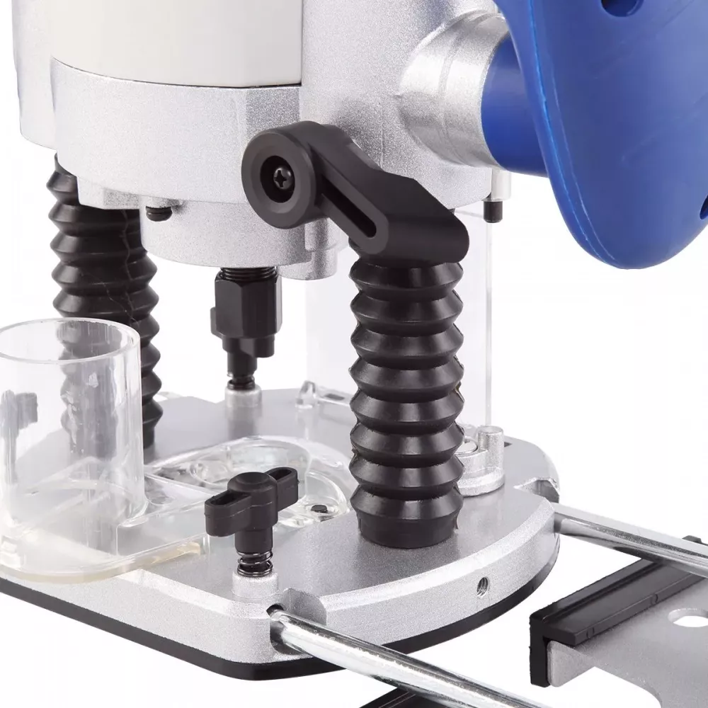 Жесткая литая подошва из алюминиевого сплава обеспечивает устойчивость инструмента, точное позиционирование оси шпинделя и минимальные вибрации при работе. Для точной фасонной резки и фрезерования на фиксированном расстоянии от угла заготовки предусмотрена направляющая пластина.