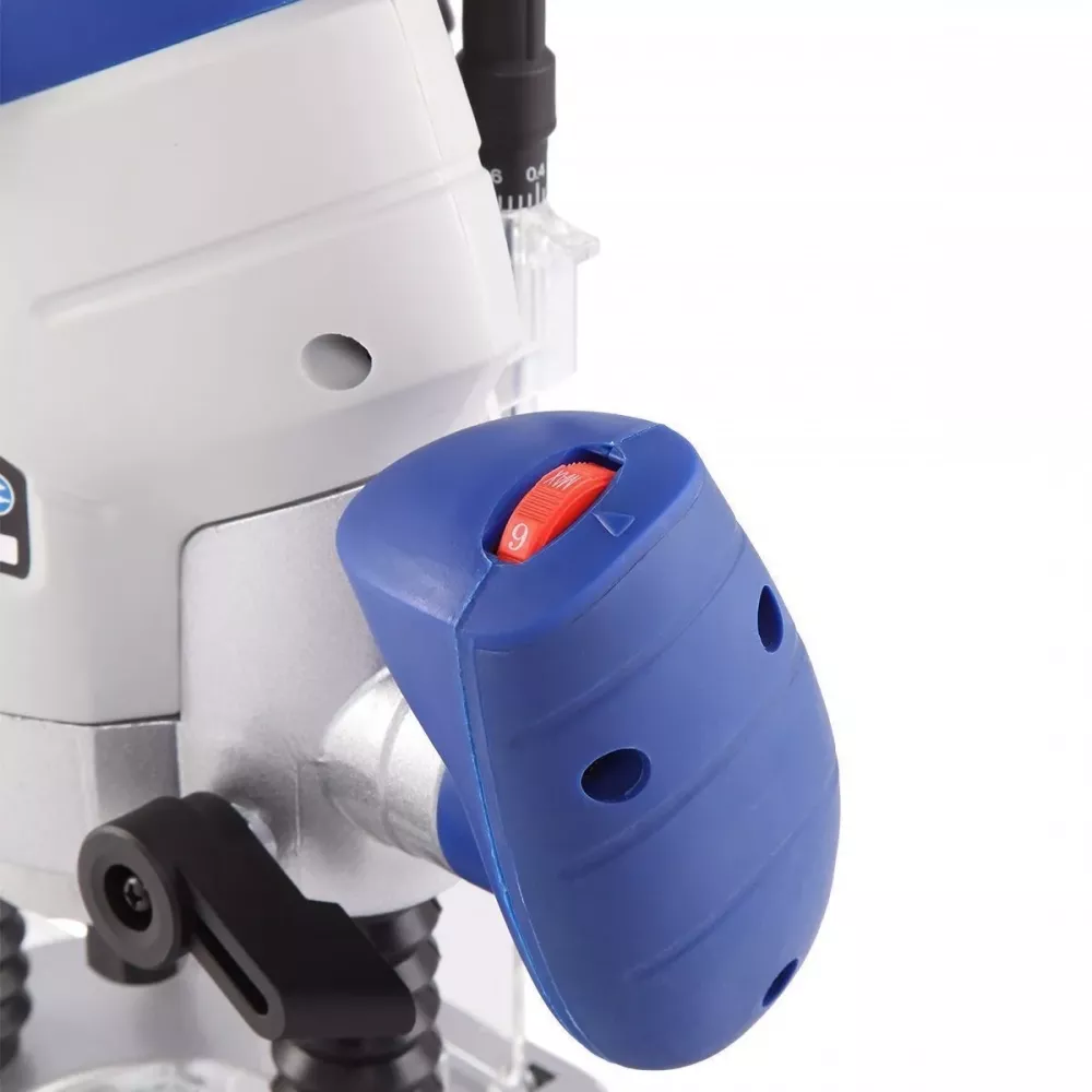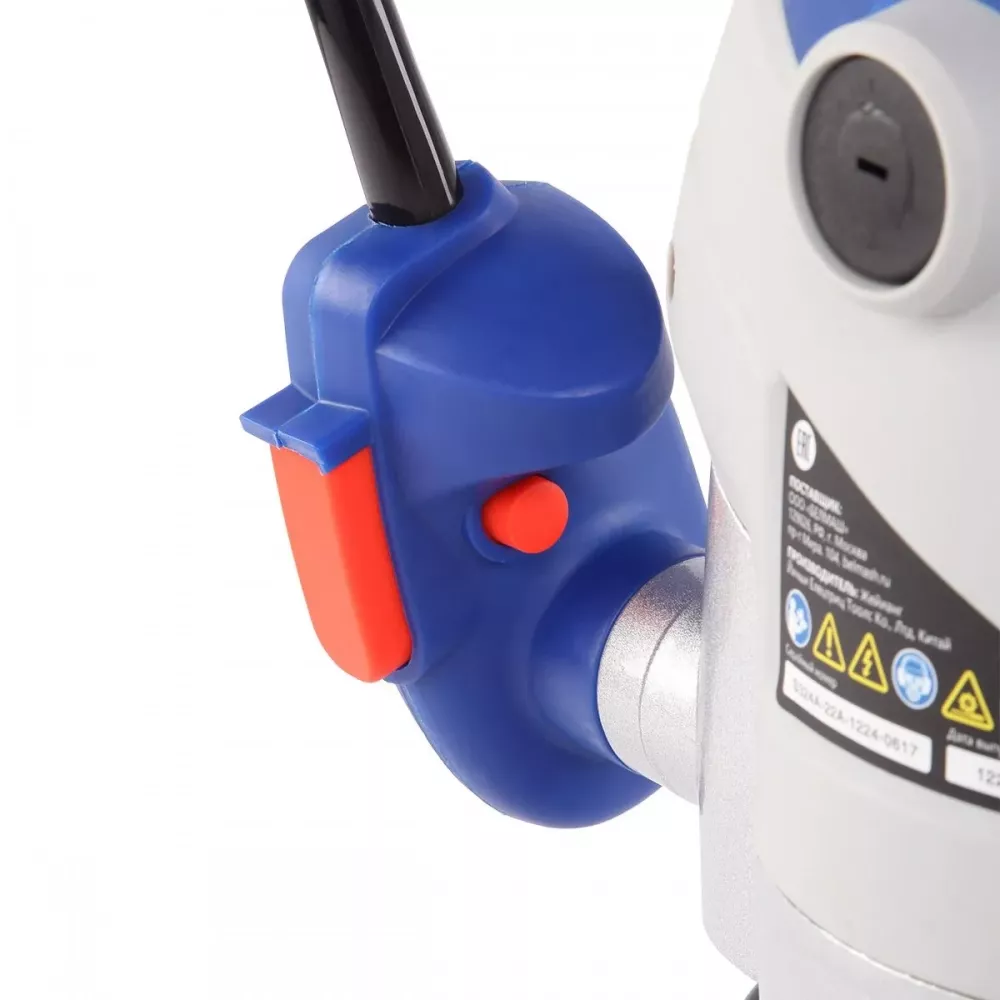 У фрезера прямой привод с возможностью регулировки частоты вращения. Скоростей семь - от 9000 до 30000 об./мин. Регулятор установлен на боковой рукоятке - это позволяет оперативно изменять частоту вращения. В комплекте зажимные цанги 6 и 8 мм, максимальный диаметр фрезы - 30 мм.