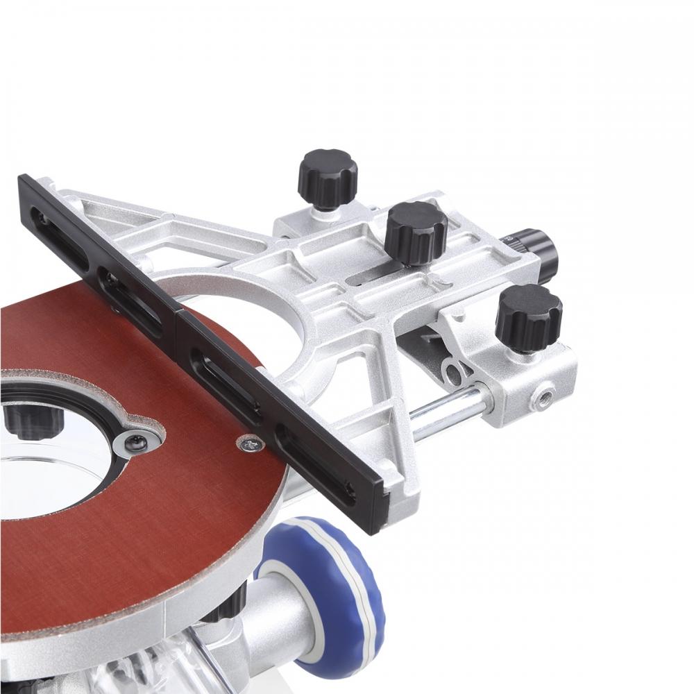 Жесткая опорная пластина из стеклотекстолитового листа обеспечивает устойчивость инструмента, точное позиционирование оси шпинделя и минимальные вибрации при работе. Для точной фасонной резки и фрезерования на фиксированном расстоянии от кромки заготовки предусмотрена направляющая пластина.