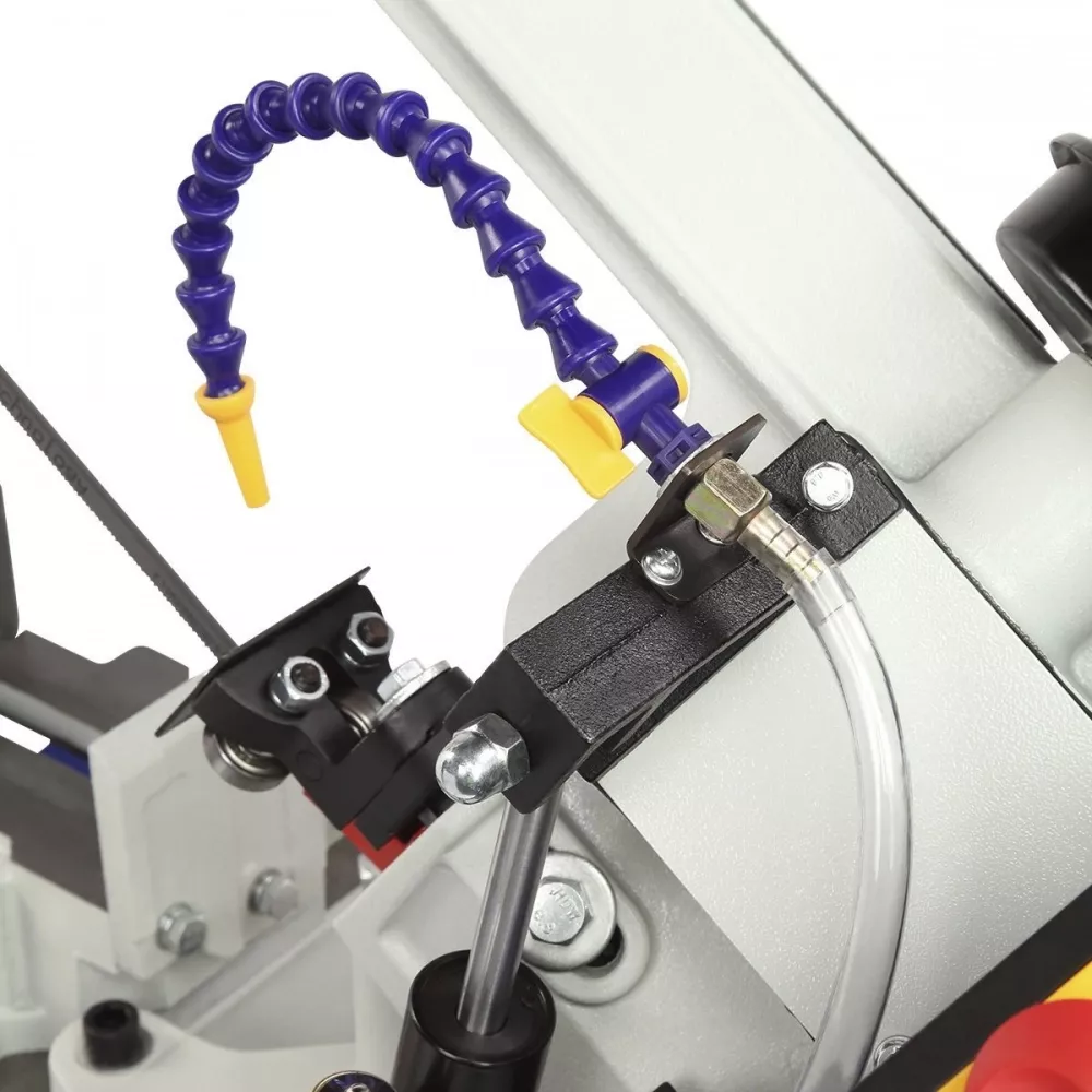 Пильная рама опускается с помощью гидравлической системы, скорость подачи которой можно регулировать клапана на гидроцилиндре. Это позволяет адаптировать станок для работы с разными материалами. После завершения реза автоматический выключатель останавливает пилу, что значительно упрощает процесс, особенно при серийном производстве.