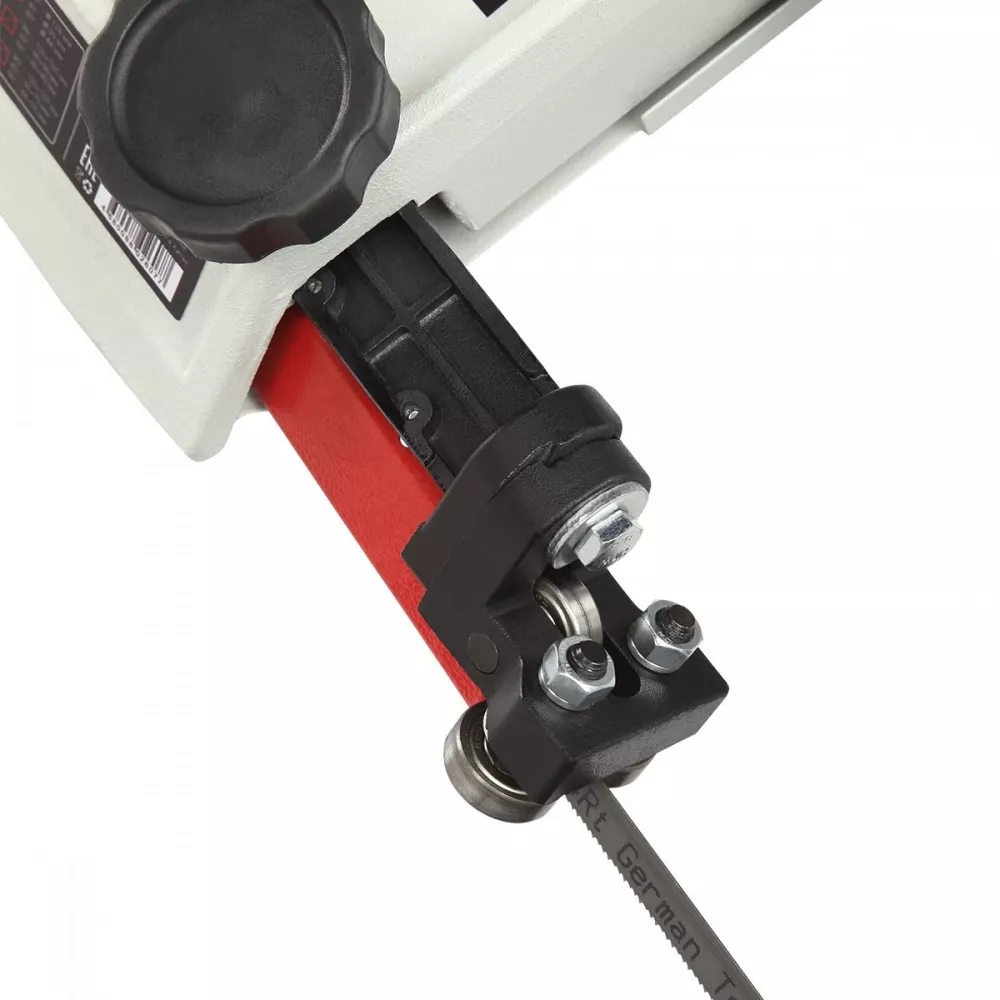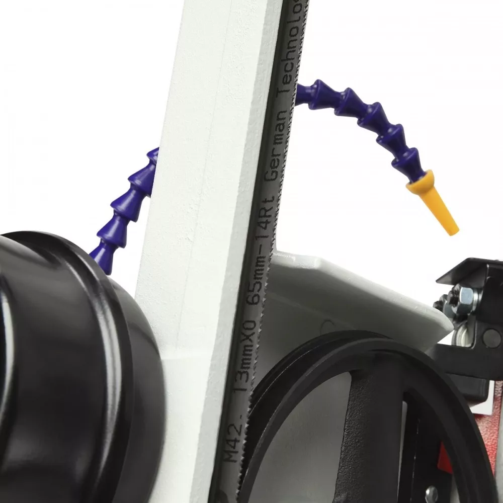 Станок оснащен мощным асинхронным двигателем 550 Вт, S1, работающим от сети 230 В. Переключение между тремя скоростями резания 20/29/50 м/мин осуществляется простым перекидыванием клинового ремня. Натяжение пильного полотна регулируется специальной ручкой, что обеспечивает стабильную работу и продлевает ресурс оборудования.