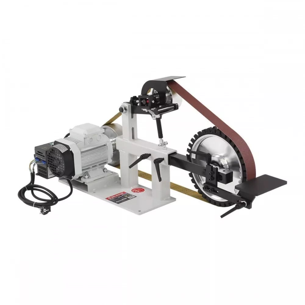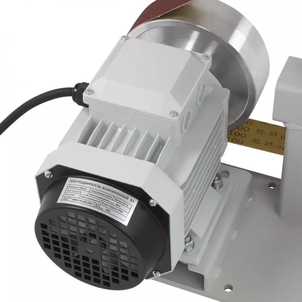 Станок оснащён асинхронным двигателем мощностью 1500 Вт, рассчитанным на длительную стабильную работу в режиме S1. Прямой привод передаёт мощность непосредственно на ленту, что положительно сказывается на эффективности и надёжности работы станка.