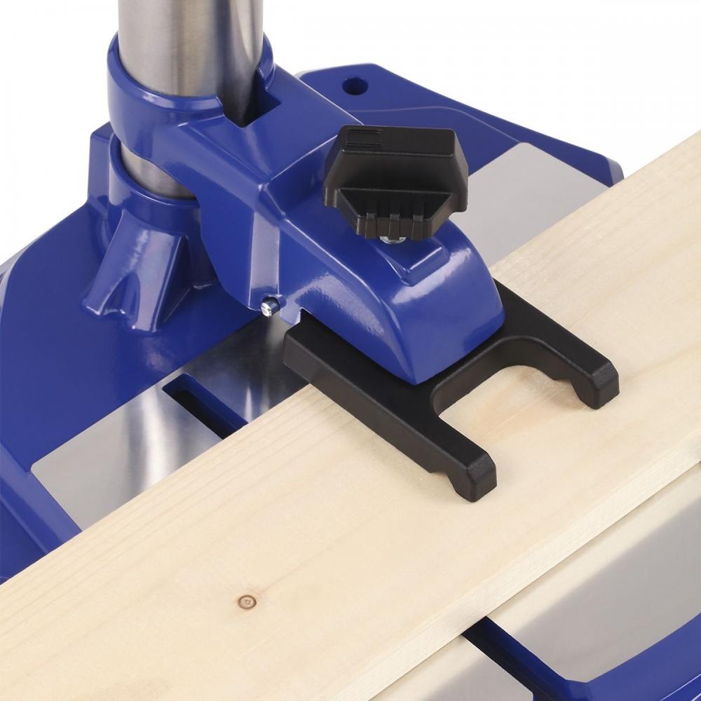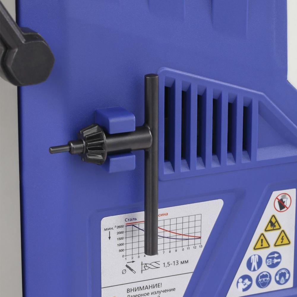 Все элементы управления расположены удобно для оператора. Рукоятка подачи обеспечивает плавное заглубление сверла. Держатель для ключа на корпусе исключает его потерю. Небольшой вес облегчает перемкщение станка, а жесткая конструкция обеспечивает устойчивость при сверлении.