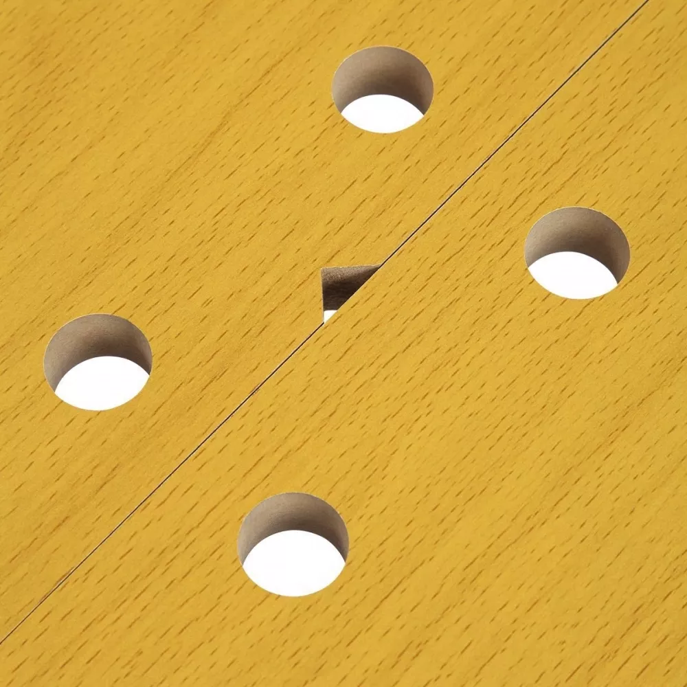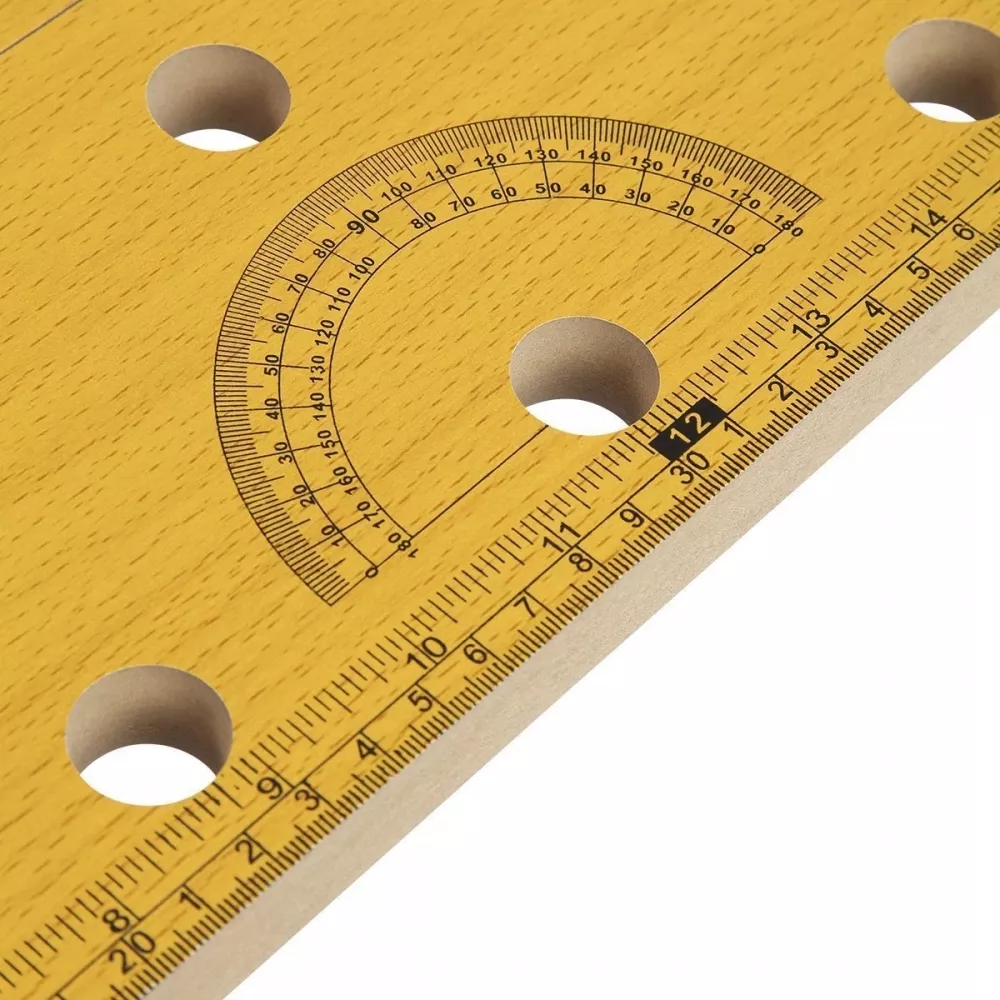 Верстак представляет собой металлическую сборную конструкцию с составной столешницей. Она выполнена из МДФ с нанесением мерной линейки диапазоном 0...605 мм и транспортира 0...180°.